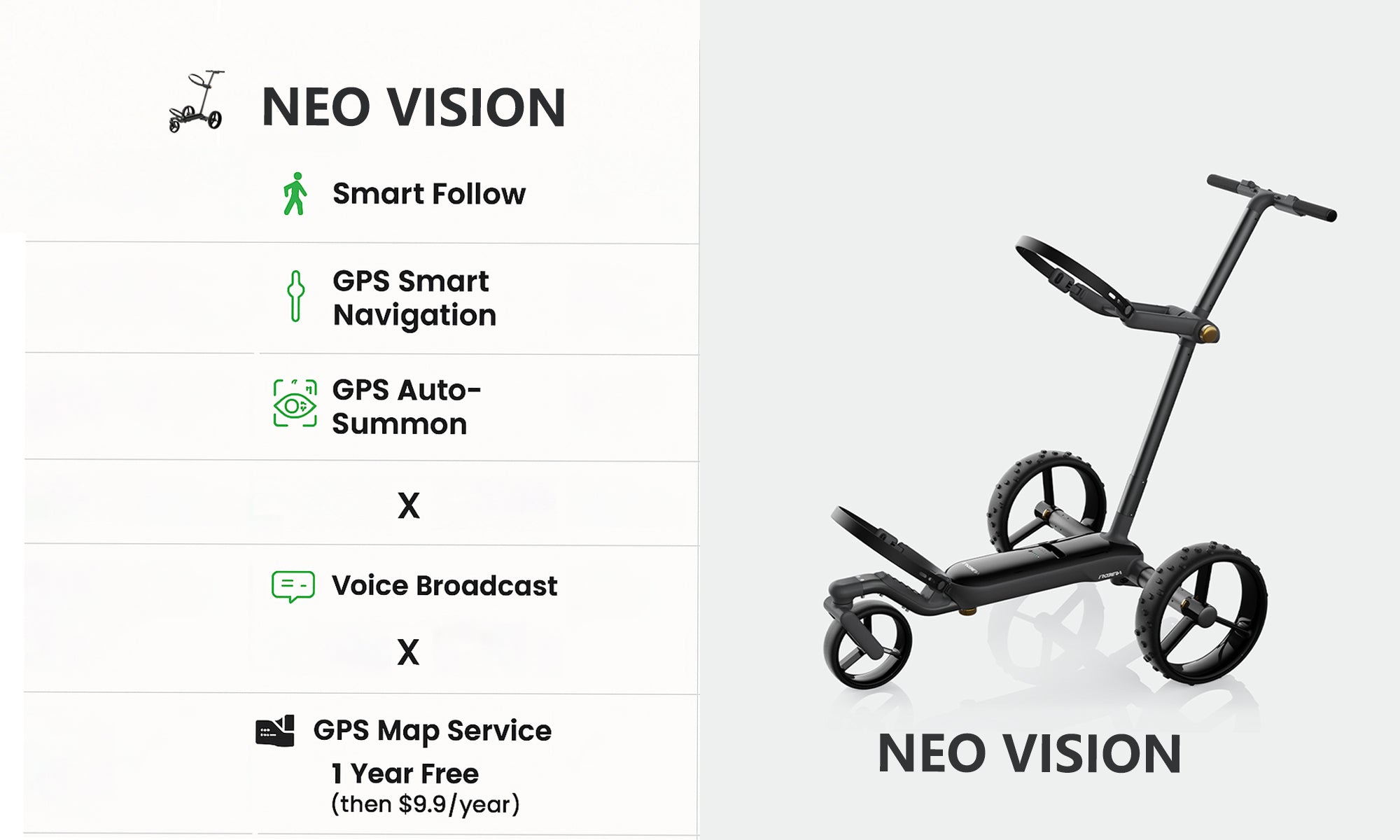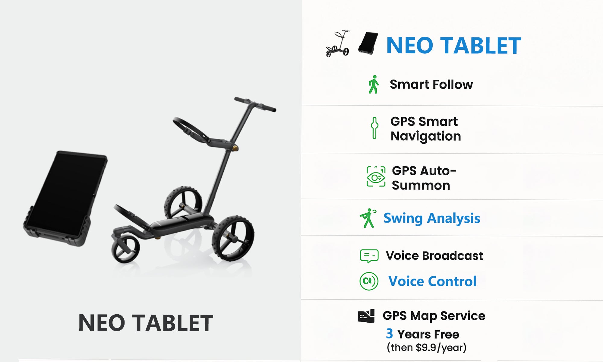Smart Follow & Gestures: AI vision follows you; hand gestures control follow mode.GPS Navigate: 40,000+ maps, tap or voice command (tablet only) for effortless fairway navigation.